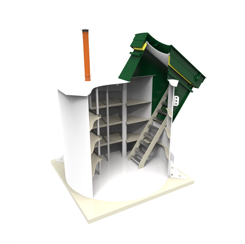 Конструкция представляет собой цилиндр из полимера расчетной толщины. Такая форма равномерно распределяет внешнее давление и превосходит по устойчивости прямоугольные аналоги.
