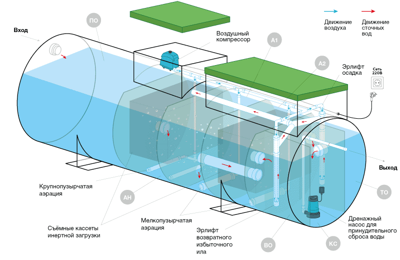 - Система аэрации обеспечивает глубокую биологическую очистку сточных вод;