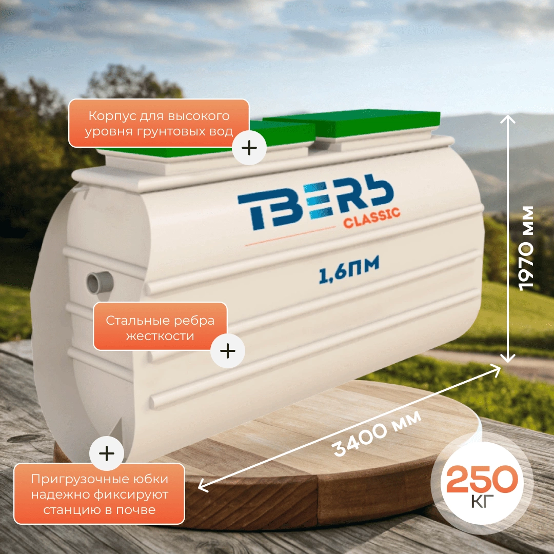 Производительность модели ТВЕРЬ Classic 1,6ПМ составляет до 1600 литров сточных вод в сутки. Такой объем рассчитан на средний расход воды 150–170 литров на человека. Система способна выдерживать залповые сбросы, например при сливе полной ванны или одновременной работе нескольких сантехнических приборов.